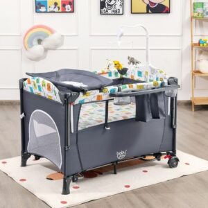 5-in-1 Baby Nursery Center Foldable Toddler Bedside Crib with Music Box-Gray – Color: Gray