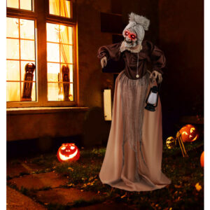 Life-Size Halloween Animatronic Moving and Talking Old Lady Hag Prop – Color: Brown