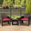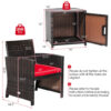 Specifications: Color of PE rattan Mix Brown Color of cushion Off White/Gray/Turquoise/Red Material PE Rattan steel polyester sponge tempered glass polyester PU painting Overall dimension of each sofa 24.5″x 23.5″x 30.5″ (L x W x H) Seat height from the ground 14.5″ Dimension of each cushion 19″x 20″x 2″ (L x W x Thickness) Overall dimension of table 16″x 16″x 16″ (L x W x H) Dimension of inner storage space 14.5″x 14″x 14″ (L x W x H) Net weight of each sofa 13 lbs Net weight of table 11 lbs Weight capacity of each sofa 350 lb Weight capacity of table 66 lbs