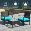 Specifications: Color Black/Turquoise/Red/Gray Rattan Material PE Material Polyester Sponge steel wicker Maximum load bearing of chair 330 Ibs Maximum load bearing of table 110 Ibs Size of chair 23.5″ x 23″ x 29″ (L x W x H) Size of table 19.5″ x 19.5″ x 15″ (L x W x H) Dimension of cushion 21″ x 18″ x 20″(L x W x H)