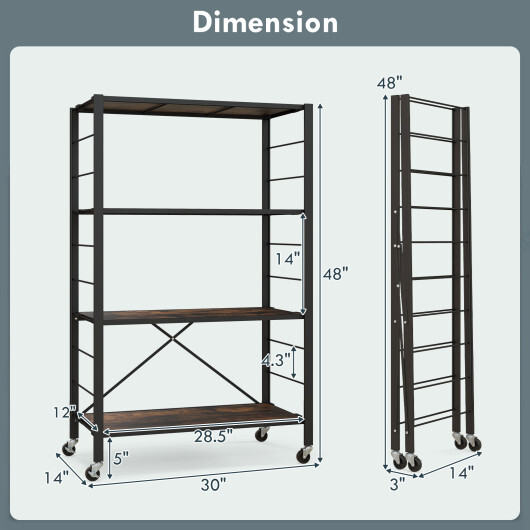 Specifications: Color Black + Rustic Brown Material MDF Metal Unfolded Dimension 30″ x 14″ x 48″ Folded Dimension 14″ x 3″ x 48″ Height of the Bottom Shelf 5″ Total Weight Capacity 180 lbs Net Weight 23 lbs