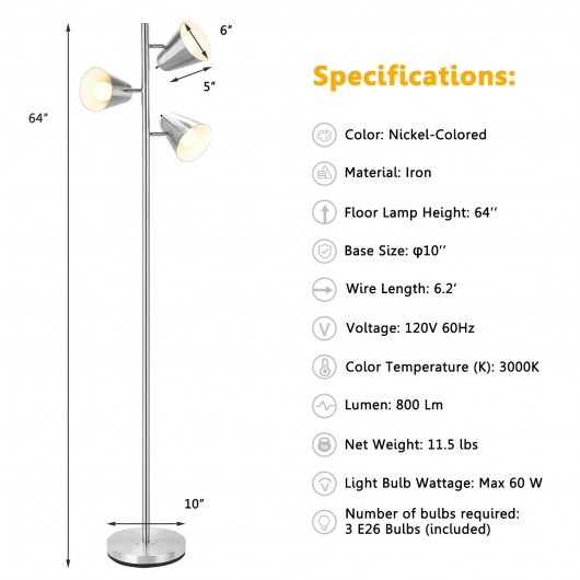 Specifications: Color: Golden/Silver Material: Metal Overall Dimension: 10″ x 64″ (Dia x H) Dimension of Lampshade: 5″ x 5.5″ (Dia x H) Cord Length: 77″ Net Weight: 10 lbs Voltage: 120V/60Hz Wattage: Max 60W Type A Bulb Max 9W LED Bulb Bulb Included: 3 x A19 Bulb Base: E26