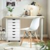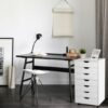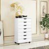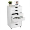 Made of durable engineered wood this storage cabinet can be used for a long time. 7 large drawers provide ample storage space which is very suitable for storing your documents snacks cosmetics etc. Smooth sliding rails and user-friendly concave handles ensure easy access to items. This cabinet also features four 360? swivel wheels which can be removed for stationary placement or installed for mobility. In addition according to the clear instructions included our 7-drawer cabinet can be easily assembled.
