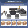 Specifications: PE Rattan Color of Patio Sofa Set: Mix Gray PE Rattan Color of Fire Pit Table: Black Color of Cushions: Black/Gray/Navy/Red/Turquoise/Off White Material: PE Rattan Steel Tempered Glass Polyester Sponge Ceramic Heat Output: 60 000 BTU Overall Dimension of Fire Pit Table: 42″ x 20″ x 25″ (L x W x H) Overall Dimension of Coffee Table: 39.5″ x 20″ x 13.5″ (L x W x H) Overall Dimension of Storage Box: 33.5″ x 29.5″ x 26″ (L x W x H) Overall Dimension of Each Ottoman: 17.5″ x 17.5″ x 16″ (L x W x H) Overall Dimension of Each Corner Sofa: 29.5″ x 29.5″ x 25.5″ (L x W x H) Overall Dimension of Each Armless Sofa: 28″ x 27″ x 25″ (L x W x H) Dimension of Each Ottoman’s Cushion: 17.5″ x 17.5″ x 4″ (L x W x Thickness) Dimension of Each Corner Sofa’s Back Cushion: 26″ x 14″ x 7″ (L x W x Thickness) Dimension of Each Corner Sofa’s Seat Cushion: 25″ x 25″ x 4″ (L x W x Thickness) Dimension of Each Armless Sofa’s Back Cushion: 27.5″ x 14″ x 7″ (L x W x Thickness) Dimension of Each Armless Sofa’s Seat Cushion: 27″ x 25″ x 4″ (L x W x Thickness) Overall Dimension of Full Storage: 93″ x 29.5″ x 26″ (L x W x H) Seat Height from the Ground for Each Corner Sofa: 12.5″ Seat Height from the Ground for Each Armless Sofa: 13.5″ Net Weight of Fire Pit Table: 65.5 lbs Net Weight of Coffee Table: 23 lbs Net Weight of Storage Box: 22 lbs Net Weight of Each Ottoman: 10 lbs Net Weight of Each Corner Sofa: 20 lbs Net Weight of Each Armless Sofa: 18 lbs Weight Capacity of Fire Pit Table: 220 lbs Weight Capacity of Coffee Table: 165 lbs Weight Capacity of Each Ottoman: 350 lbs Weight Capacity of Each Corner Sofa: 350 lbs Weight Capacity of Each Armless Sofa: 350 lbs